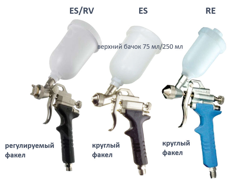Экономичная линия миникраскораспылителей. Удобство и надежность сочетаются с точностью и высоким качеством нанесения ЛКМ при низком потреблении воздуха. Модели ES/RV имеют регулируемый факел, модели ES и RE с круглым факелом предназначены для особо точных работ. Миникраскораспылители широко применяются в кузовном ремонте, производстве мебели, при выполнении декоративных работ и в промышленной окраске.