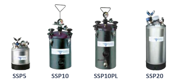 Баки SSP10 комплектуются алюминиевым ведром-вкладышем ёмкостью 5,5 л и имеют систему полуавтоматической промывки материального шланга и краскораспылителя.